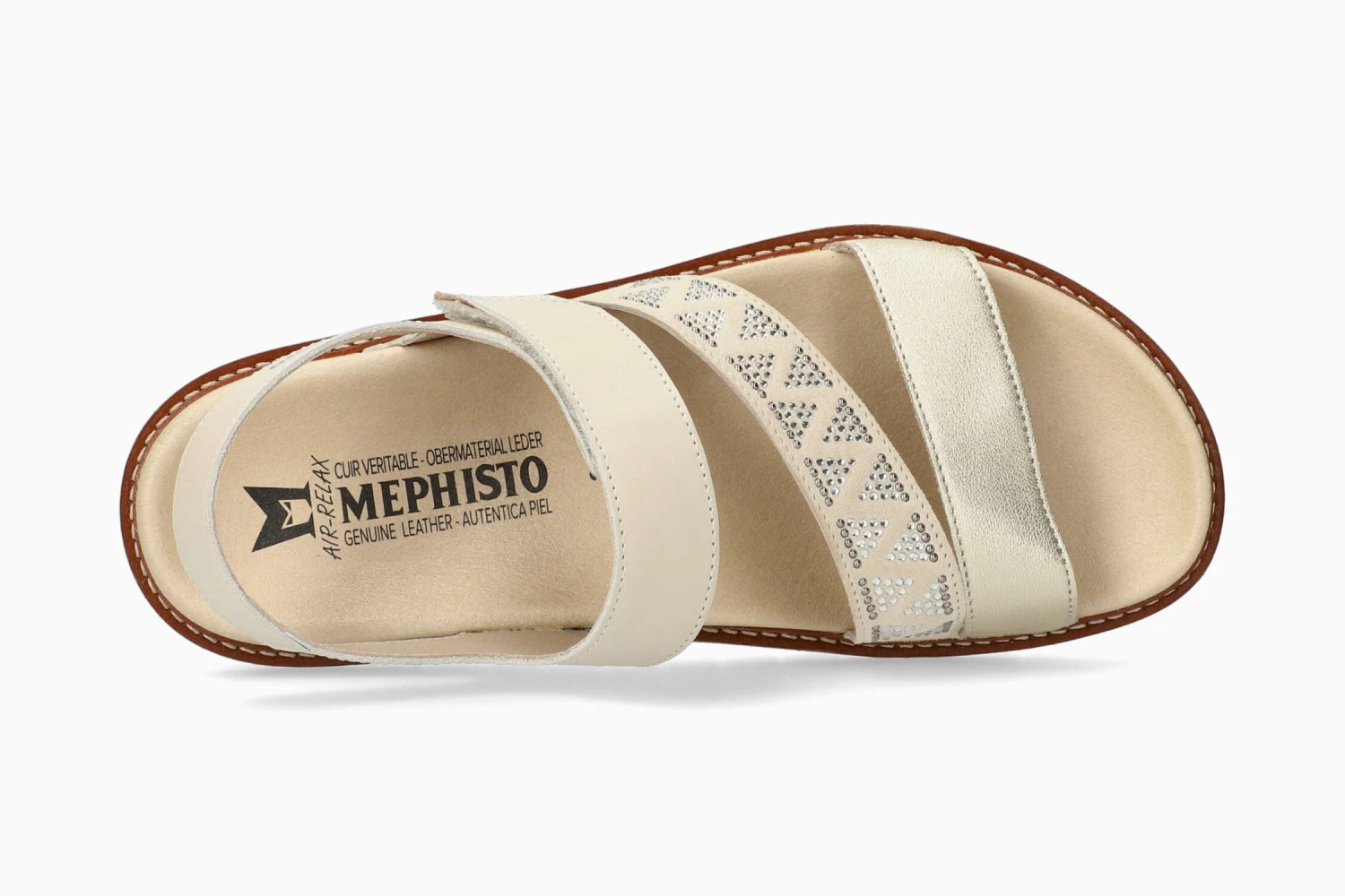 This lightweight sandal is a treasure trove of femininity, thanks to its rhinestones which give it a very dressy look. The SOFT-AIR midsole and the SHOCK-ABSORBER, integrated in the outsole, minimise impact for a gentle, effortless walk. The AIR-RELAX technology respects the anatomy of the foot to prevent fallen arches. The adjustable adhesive strap ensures an excellent fit. Its leather lining promotes a healthy climate inside the shoe.